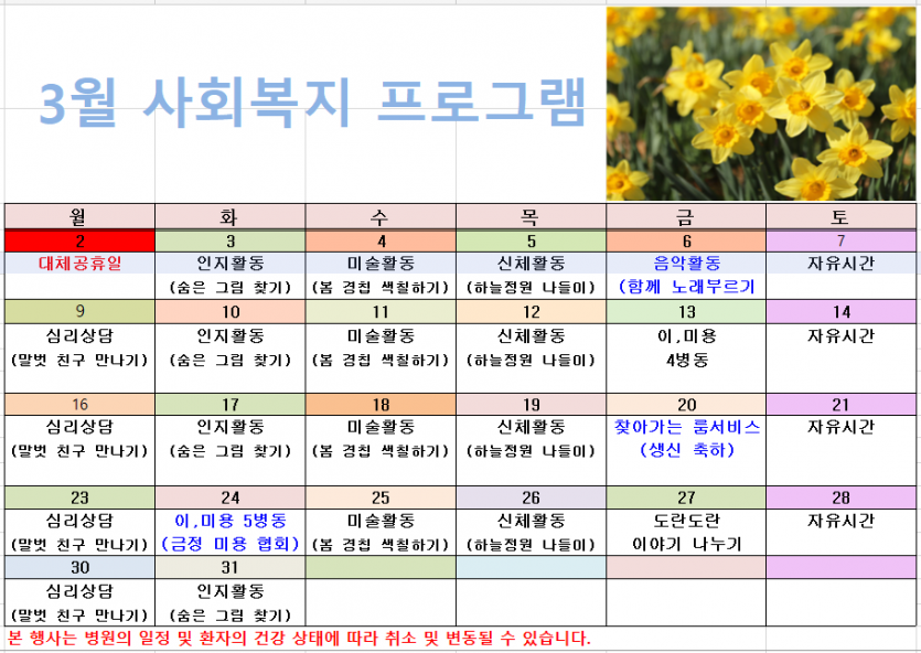 2026.03월 사회복지 프로그램 일정표 페이지 정보 작성자 관자재요양병원 댓글 0건 조회 88회 작성일 26-02-27 08:44 본문 우리 어르신들과 함께 즐거운 봄 마중 하는 3월 보내겠습니다. 목록 다음글설 연휴 면회 안내 26.02.02 댓글목록 댓글목록 등록된 댓글이 없습니다.