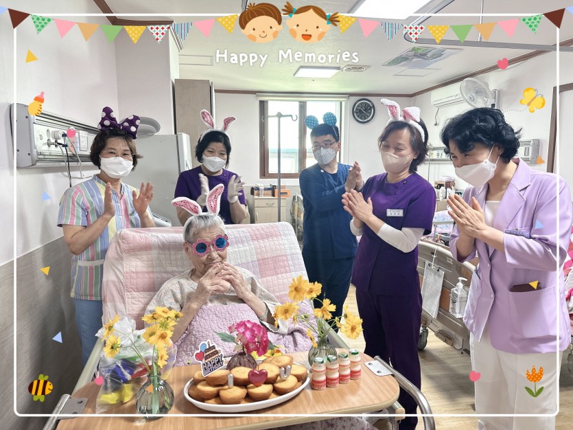 병실로 방문하여 계절 꽃 케잌, 선물, 간식등과 함께 축하 노래를 불러 드렸습니다.