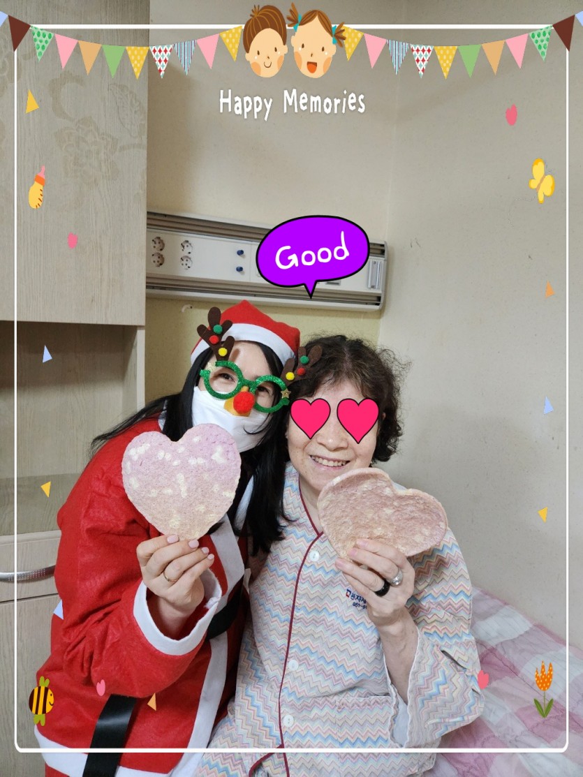 저의 마음을 담은 하트 뻥틔기와 맛난 과자 선물을 담아 각 병실로 방문하였습니다.