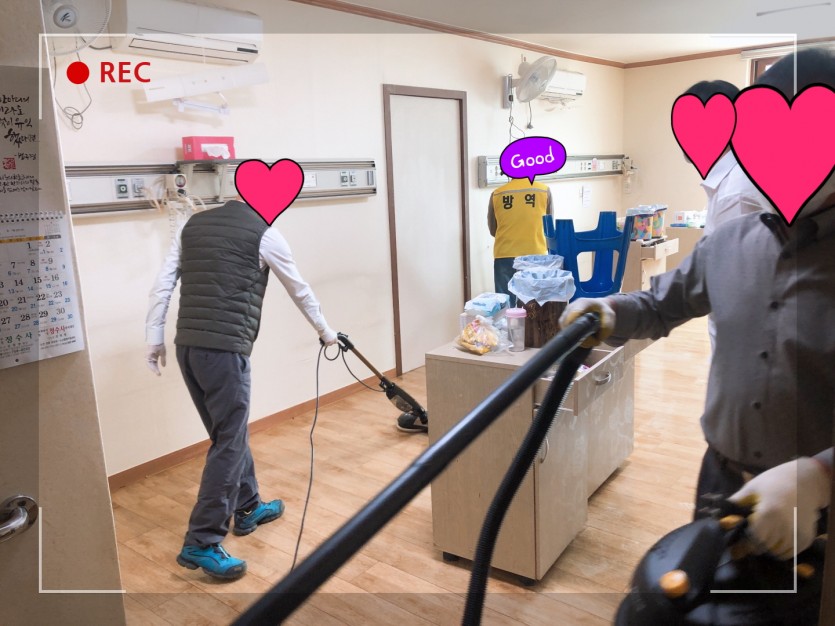 병실바닥은 소독하고 닦은 뒤 스팀으로 한번 더~ 깨끗하게 닦아내었습니다.