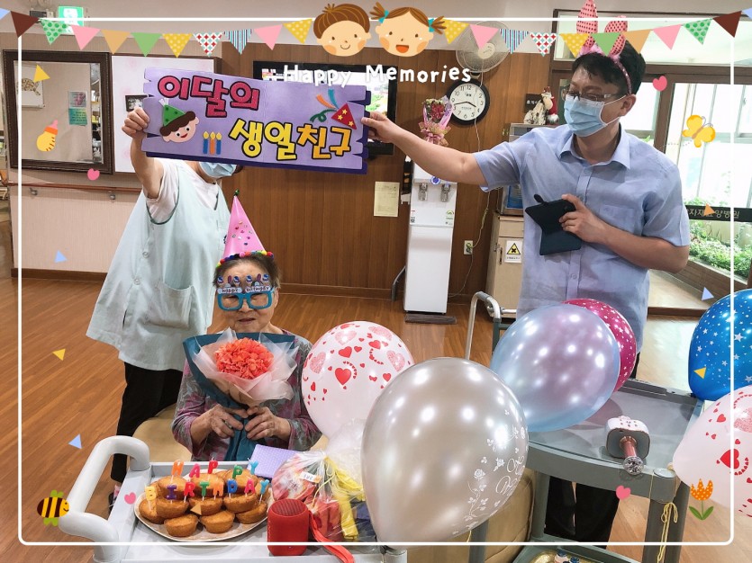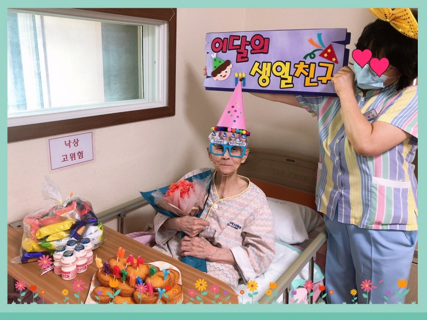 8월 생신을 맞으신 어르신들의 각 병실로 찾아가는 룸서비스를 진행하였습니다.