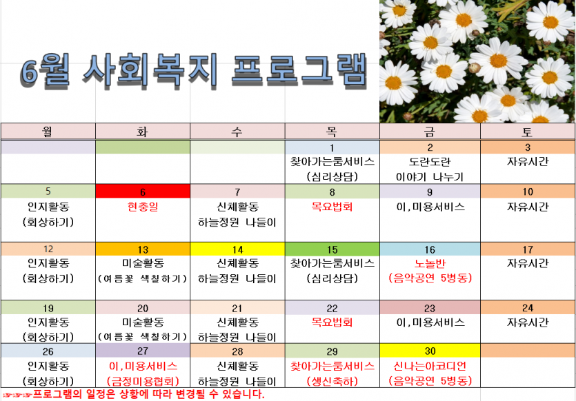 2023.06월 사회복지 프로그램 일정표 페이지 정보 작성자 관자재요양병원 댓글 0건 조회 839회 작성일 23-05-31 14:02 본문 우리 어르신들과 함께 즐겁고 행복한 시간 보내겠습니다. 목록 이전글2023. 원내 환경개선 공사 23.06.19 다음글2023. 05월 사회복지 프로그램 일정표 23.04.27 댓글목록 댓글목록 등록된 댓글이 없습니다.