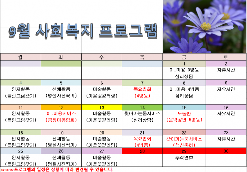 2023. 09월 사회복지 프로그램 일정표 페이지 정보 작성자 관자재요양병원 댓글 0건 조회 848회 작성일 23-09-01 09:51 본문 우리 어르신들과 함께 즐거운 9월 보내겠습니다. 목록 이전글2023. 10월 사회복지 프로그램 일정표 23.10.01 다음글2023. 08월 사회복지 프로그램 일정표 23.07.31 댓글목록 댓글목록 등록된 댓글이 없습니다.