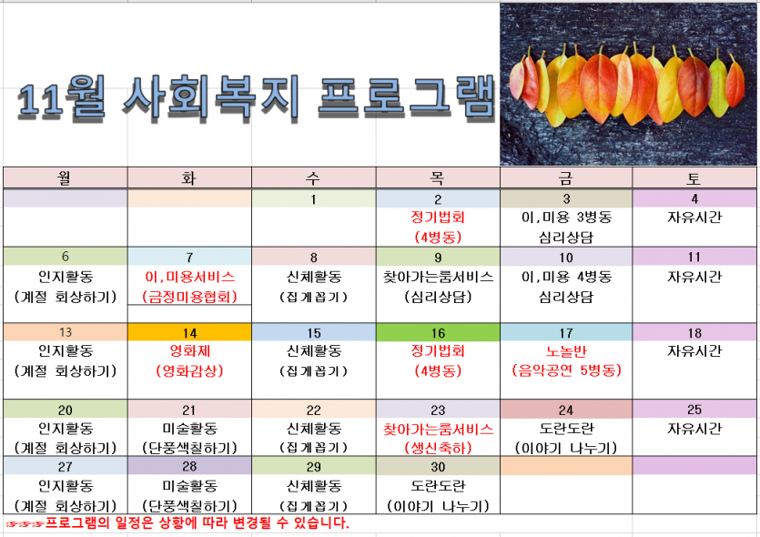 2023. 11월 사회복지 프로그램 일정표 페이지 정보 작성자 관자재요양병원 댓글 0건 조회 828회 작성일 23-11-03 11:01 본문 우리 어르신들과 함께 행복한 11월 보내겠습니다. 목록 이전글2023. 12월 사회복지 프로그램 일정표 23.12.08 다음글2023. 10월 사회복지 프로그램 일정표 23.10.01 댓글목록 댓글목록 등록된 댓글이 없습니다.