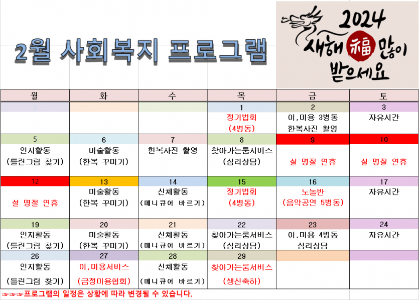 2024. 02월 사회복지 프로그램 일정표 페이지 정보 작성자 관자재요양병원 댓글 0건 조회 850회 작성일 24-01-31 09:11 본문 우리 어르신들과 함께 따뜻한 설 명절 보내겠습니다. 목록 이전글2024년 건강보험 의료수가 인상에 따른 본인부담 병원비 인상 관련 안내입니다. 24.02.05 다음글2024. 01월 사회복지 프로그램 일정표 23.12.29 댓글목록 댓글목록 등록된 댓글이 없습니다.