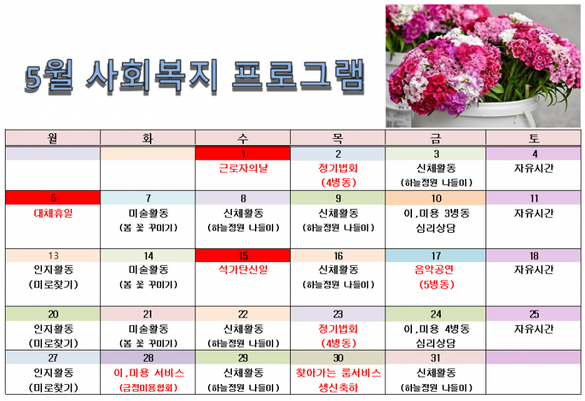 2024. 05월 사회복지 프로그램 일정표 페이지 정보 작성자 관자재요양병원 댓글 0건 조회 773회 작성일 24-04-30 16:12 본문 우리 어르신들과 함께 행복한 시간 보내겠습니다. 목록 이전글2024. 06월 사회복지 프로그램 일정표 24.05.31 다음글2024.04월 사회복지 프로그램 일정표 24.04.03 댓글목록 댓글목록 등록된 댓글이 없습니다.