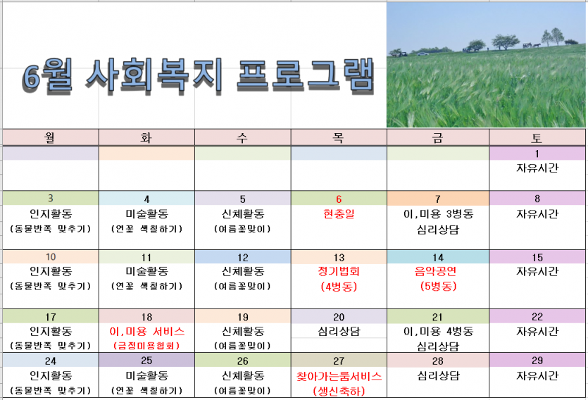2024. 06월 사회복지 프로그램 일정표 페이지 정보 작성자 관자재요양병원 댓글 0건 조회 806회 작성일 24-05-31 09:25 본문 우리 어르신들과 함께 건강하고 행복한 6월 보내겠습니다. 목록 이전글2024. 07월 사회복지 프로그램 일정표 24.06.28 다음글2024. 05월 사회복지 프로그램 일정표 24.04.30 댓글목록 댓글목록 등록된 댓글이 없습니다.