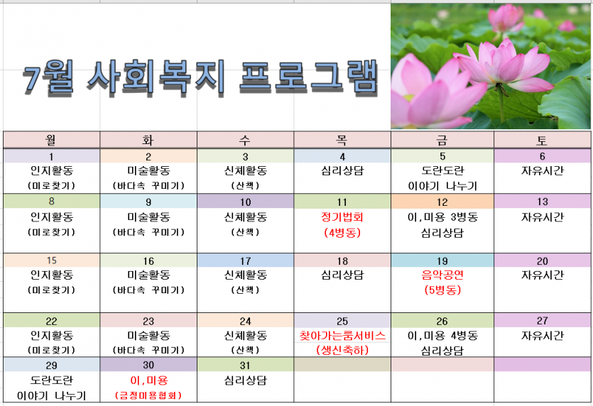 2024. 07월 사회복지 프로그램 일정표 페이지 정보 작성자 관자재요양병원 댓글 0건 조회 779회 작성일 24-06-28 14:02 본문 무더운 여름 우리 어르신들과 함께 건강하게 보내겠습니다. 목록 이전글2024. 08월 사회복지 프로그램 일정표 24.07.31 다음글2024. 06월 사회복지 프로그램 일정표 24.05.31 댓글목록 댓글목록 등록된 댓글이 없습니다.