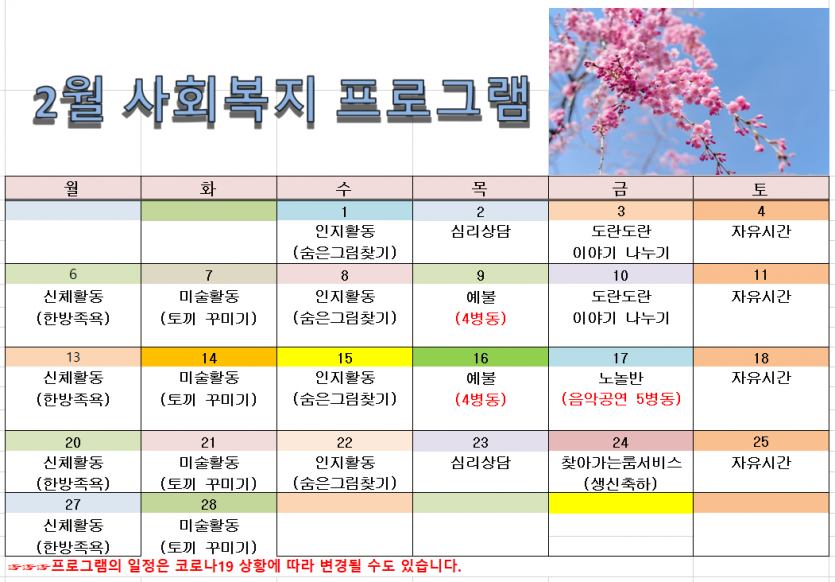 2023. 2월 사회복지 프로그램 일정표 페이지 정보 작성자 관자재요양병원 댓글 0건 조회 923회 작성일 23-02-01 08:59 본문 우리 어르신들과 함께 즐거운 시간 만들겠습니다. 목록 이전글2023. 3월 사회복지 프로그램 일정표 23.02.28 다음글<대면접촉 면회 안내 10.4> 22.10.04 댓글목록 댓글목록 등록된 댓글이 없습니다.