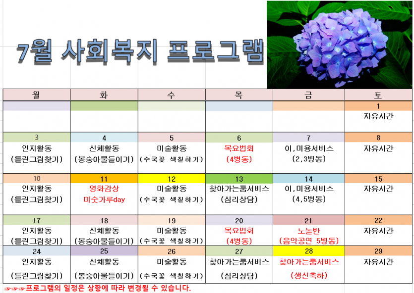 2023. 07월 사회복지 프로그램 일정표 페이지 정보 작성자 관자재요양병원 댓글 0건 조회 867회 작성일 23-06-30 11:30 본문 우리 어르신들과 함께 건강한 여름 보내겠습니다. 목록 이전글2023. 08월 사회복지 프로그램 일정표 23.07.31 다음글2023. 원내 환경개선 공사 23.06.19 댓글목록 댓글목록 등록된 댓글이 없습니다.