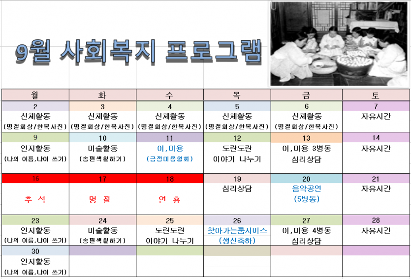 2024. 09월 사회복지 프로그램 일정표 페이지 정보 작성자 관자재요양병원 댓글 0건 조회 782회 작성일 24-08-30 09:14 본문 우리 어르신들과 함께 즐겁고 행복한 명절 보내겠습니다. 목록 이전글2024. 10월 사회복지 프로그램 일정표 24.09.30 다음글2024. 08월 사회복지 프로그램 일정표 24.07.31 댓글목록 댓글목록 등록된 댓글이 없습니다.