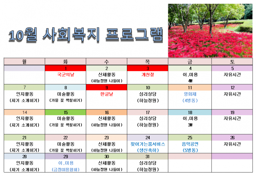 2024. 10월 사회복지 프로그램 일정표 페이지 정보 작성자 관자재요양병원 댓글 0건 조회 764회 작성일 24-09-30 11:35 본문 우리 어르신들과 함께 가을을 만끽 느끼는 10월 보내겠습니다. 목록 이전글2024. 11월 사회복지 프로그램 일정표 24.10.30 다음글2024. 09월 사회복지 프로그램 일정표 24.08.30 댓글목록 댓글목록 등록된 댓글이 없습니다.