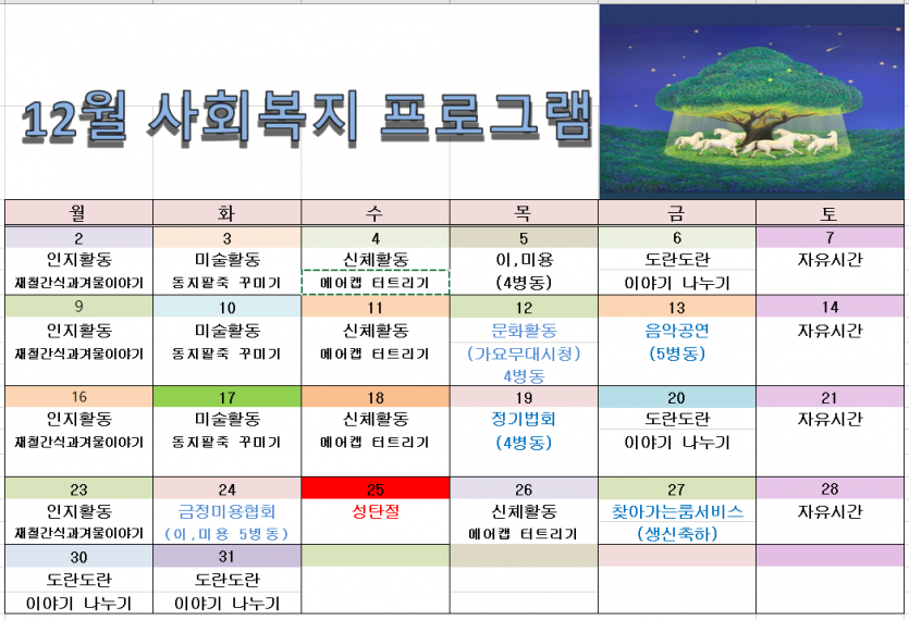 2024. 12월 사회복지 프로그램 일정표 페이지 정보 작성자 관자재요양병원 댓글 0건 조회 660회 작성일 24-12-02 10:31 본문 우리 어르신들과 함께 따뜻한 12월 보내겠습니다. 목록 이전글2025. 01월 사회복지 프로그램 일정표 25.01.02 다음글2024. 11월 사회복지 프로그램 일정표 24.10.30 댓글목록 댓글목록 등록된 댓글이 없습니다.