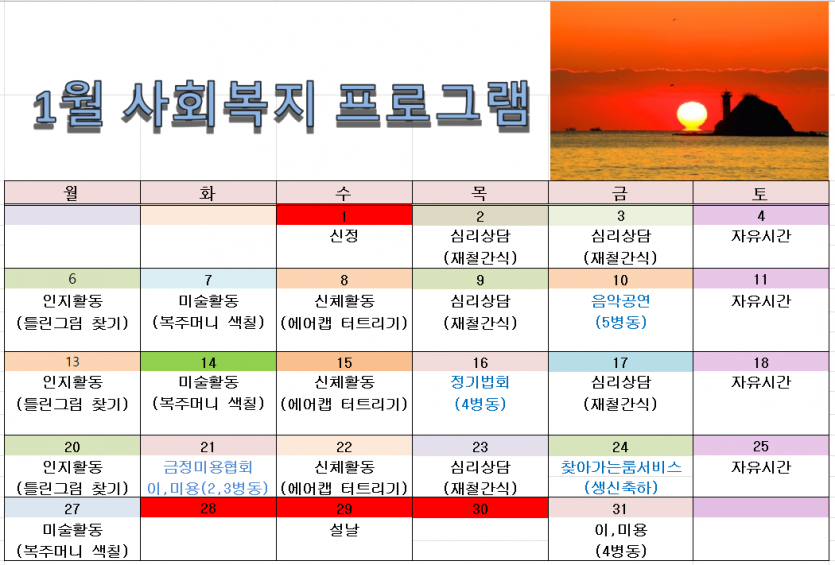 2025. 01월 사회복지 프로그램 일정표 페이지 정보 작성자 관자재요양병원 댓글 0건 조회 540회 작성일 25-01-02 08:45 본문 새로운 한 해 우리 어르신들과 함께 의미 있는 시간 보내겠습니다. 목록 이전글2025. 02월 사회복지 프로그램 일정표 25.02.03 다음글2024. 12월 사회복지 프로그램 일정표 24.12.02 댓글목록 댓글목록 등록된 댓글이 없습니다.