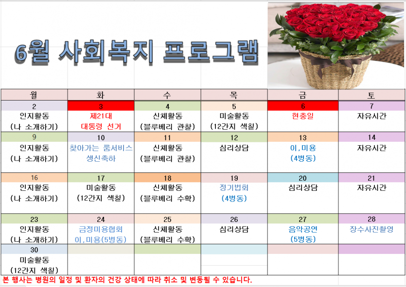 2025.06월 사회복지 프로그램 일정표 페이지 정보 작성자 관자재요양병원 댓글 0건 조회 379회 작성일 25-06-02 09:47 본문 우리 어르신들과 함께 즐거운 시간 보내겠습니다. 목록 이전글2025. 07월 사회복지 프로그램 일정표 25.07.01 다음글2025. 05월 사회복지 프로그램 일정표 25.04.30 댓글목록 댓글목록 등록된 댓글이 없습니다.