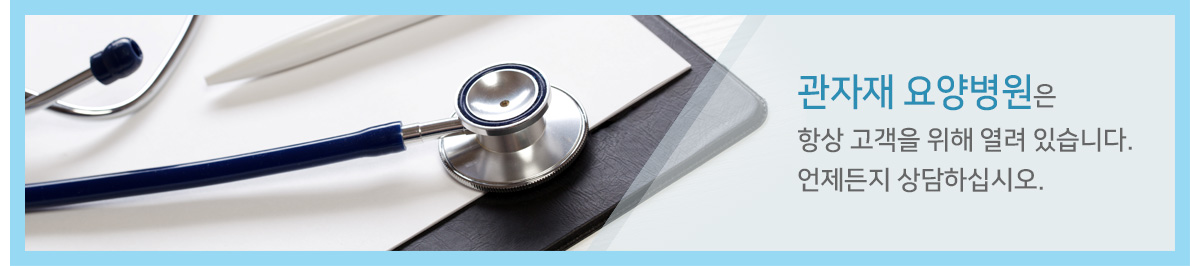 저희 관자재요양병원은 항상 고객을 위해 열려있습니다. 최상의 의료와 생활서비스로 환자분들이 지내시기에 불편함이 없도록 최선을 다하고 있습니다. 주저하지 마시고 언제든 문의 접수 상담주십시오. 관자재요양병원은 고객 여러분을 최우선으로 항상 정성과 친절을 다해 모시겠습니다.